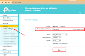 Di halaman Basic Setting, isikan nama baru untuk Wireless Network Name (SSID) sesuai keinginan Anda. Setelah itu, pilih Save untuk menyimpan perubahan.