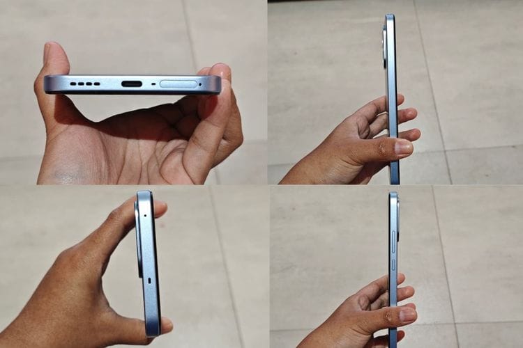 Kami merasa bodi Realme 15T 5G terasa ringan saat diangkat, bahkan ketika digenggam dengan satu tangan saja. Adapun di atas kertas, perangkat ini memang tergolong ramping bahkan untuk ponsel dengan spesifikasi baterai jumbo 7.000 mAh. Realme 15T 5G varian Silk Blue dan Suit Titanium sendiri tercatat memiliki bobot di angka 181 gram. Sementara ketebalannya di 7,79 mm.